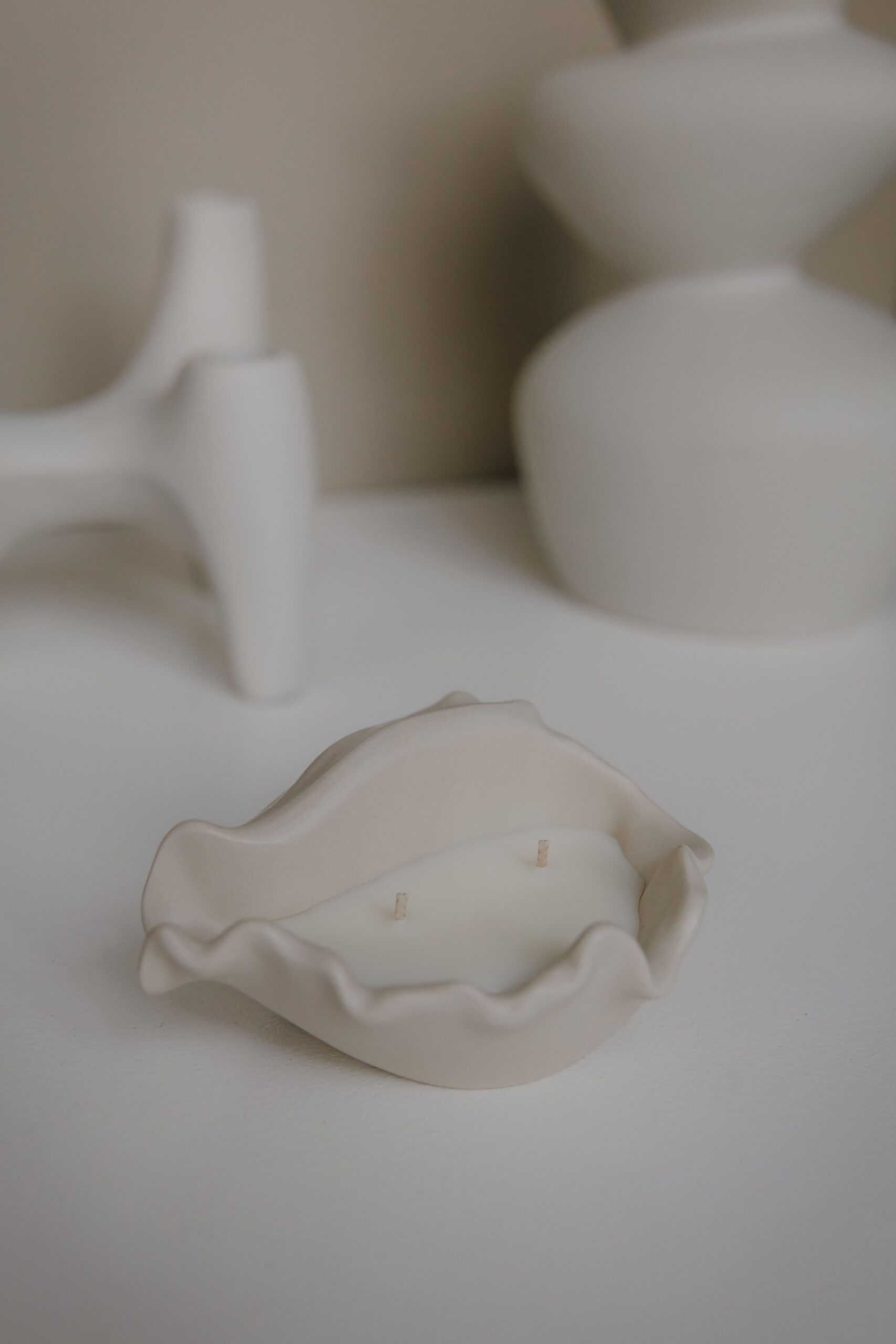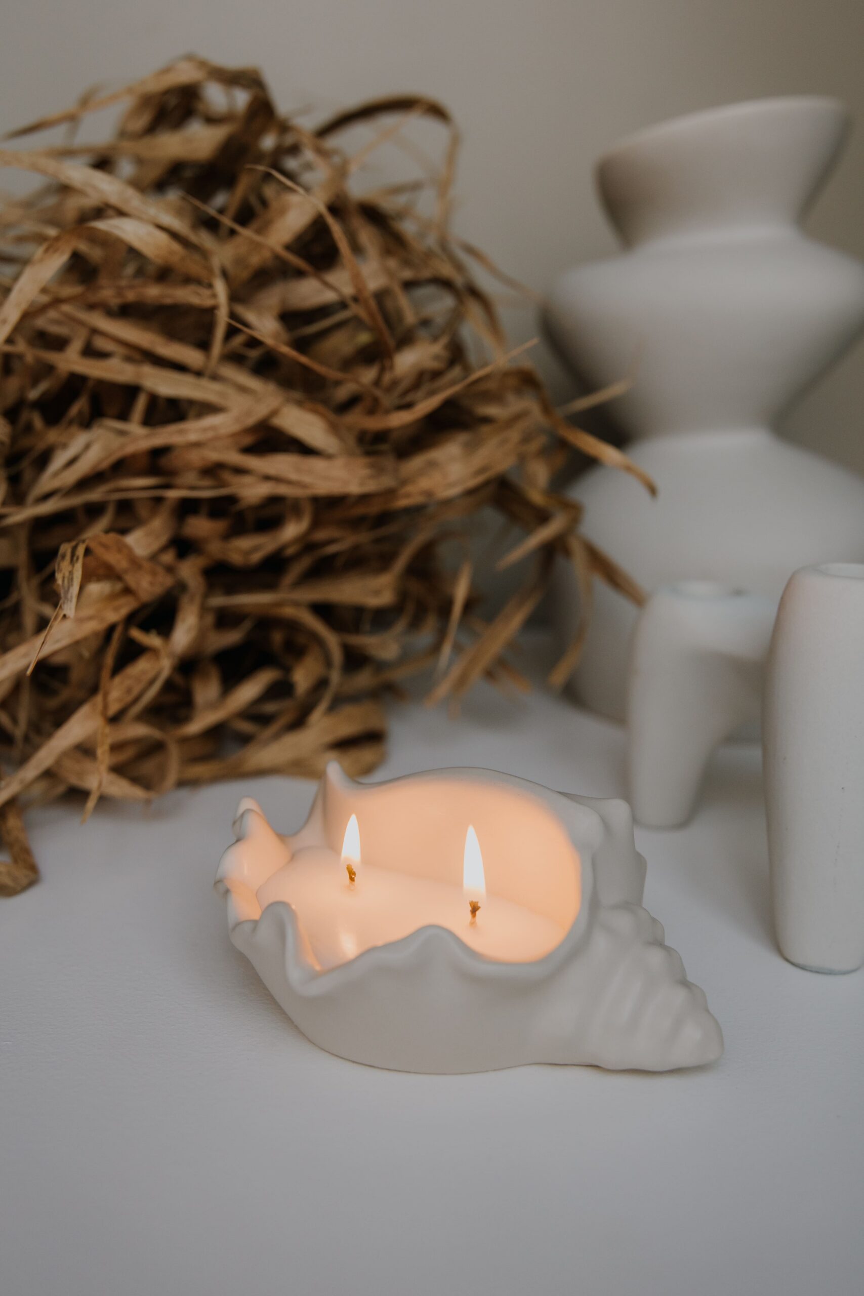 Bezzapachowa świeca sojowa Muszla w gipsowym pojemniku. Naturalna forma, delikatne światło i spokojna elegancja.